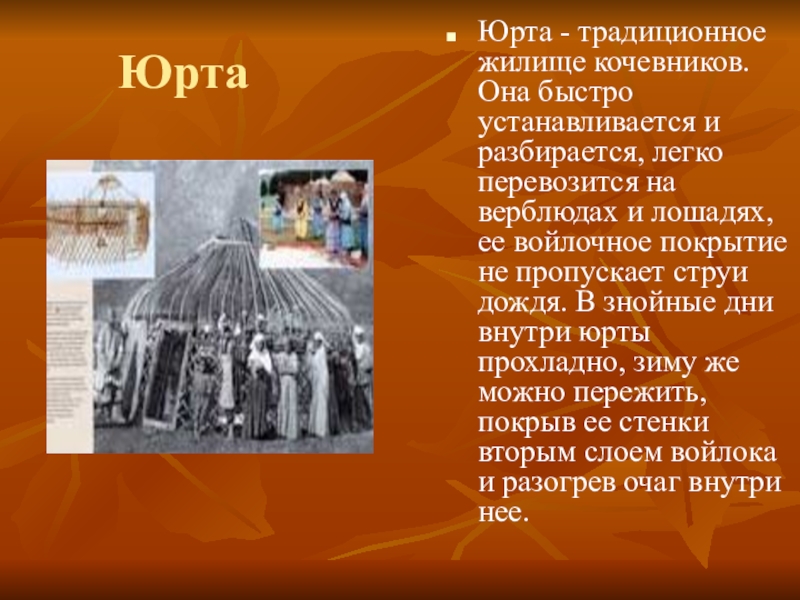 Юрта - традиционное жилище кочевников. Она быстро устанавливается и разбирается, легко перевозится на верблюдах и лошадях, ее войлочное покрытие не пропускает струи дождя. В знойные дни внутри юрты прохладно, зиму же можно пережить, покрыв ее стенки вторым слоем войлока и разогрев очаг внутри нее.