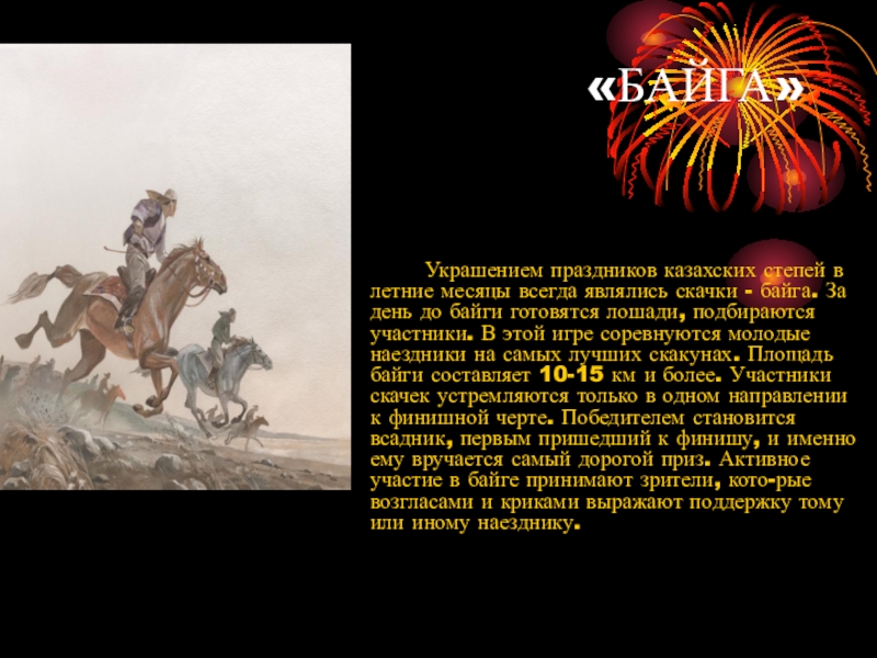 Украшением праздников казахских степей в летние месяцы всегда являлись скачки - байга. За день до байги готовятся лошади, подбираются участники. В этой игре соревнуются молодые наездники на самых лучших скакунах. Площадь байги составляет 10-15 км и более. Участники скачек устремляются только в одном направлении к финишной черте. Победителем становится всадник, первым пришедший к финишу, и именно ему вручается самый дорогой приз. Активное участие в байге принимают зрители, кото-рые возгласами и криками выражают поддержку тому или иному наезднику.