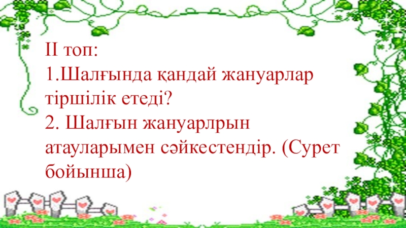 ІІ топ:1.Шалғында қандай жануарлар тіршілік етеді?2. Шалғын жануарлрын атауларымен сәйкестендір. (Сурет бойынша)