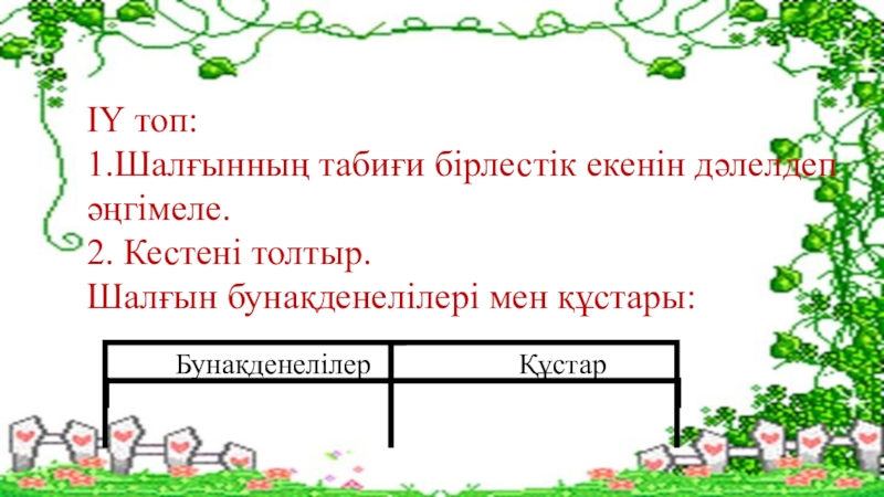 ІҮ топ:1.Шалғынның табиғи бірлестік екенін дәлелдеп әңгімеле.2. Кестені толтыр.Шалғын бунақденелілері мен құстары: