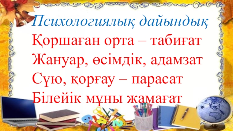 Психологиялық дайындықҚоршаған орта – табиғатЖануар, өсімдік, адамзатСүю, қорғау – парасатБілейік мұны жамағат
