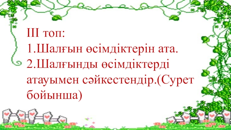 ІІІ топ:1.Шалғын өсімдіктерін ата.2.Шалғынды өсімдіктерді атауымен сәйкестендір.(Сурет бойынша)
