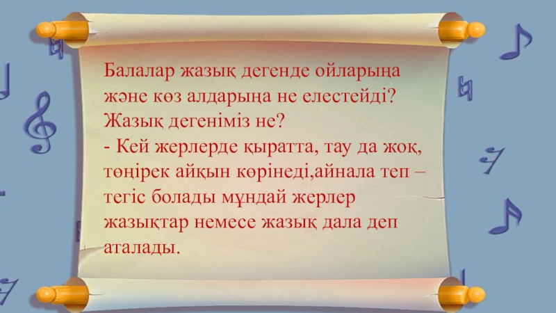 Балалар жазық дегенде ойларыңа және көз алдарыңа не елестейді? Жазық дегеніміз не?- Кей жерлерде қыратта, тау да