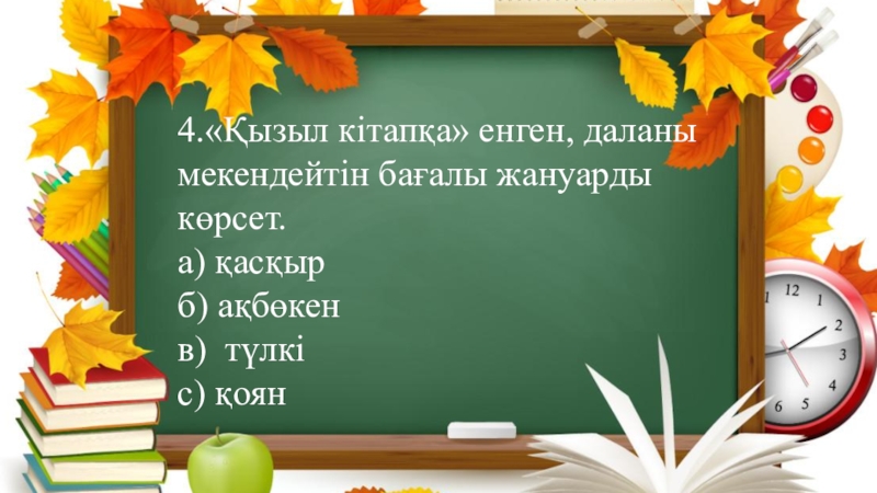 4.«Қызыл кітапқа» енген, даланы мекендейтін бағалы жануарды көрсет.а) қасқыр б) ақбөкен  в) түлкі с) қоян