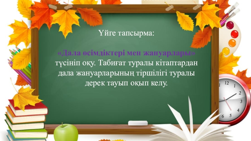 Үйге тапсырма:«Дала өсімдіктері мен жануарлары»  түсініп оқу. Табиғат туралы кітаптардан дала жануарларының тіршілігі туралы дерек тауып