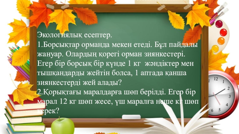 Экологиялық есептер.1.Борсықтар орманда мекен етеді. Бұл пайдалы жануар. Олардың қорегі орман зиянкестері. Егер бір борсық бір күнде