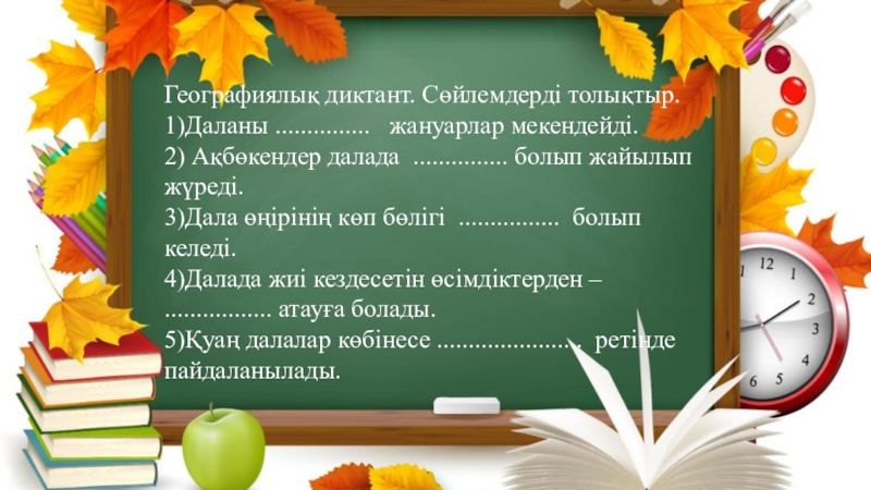 Географиялық диктант. Сөйлемдерді толықтыр.1)Даланы ...............  жануарлар мекендейді.2) Ақбөкендер далада ............... болып жайылып жүреді.3)Дала өңірінің көп бөлігі