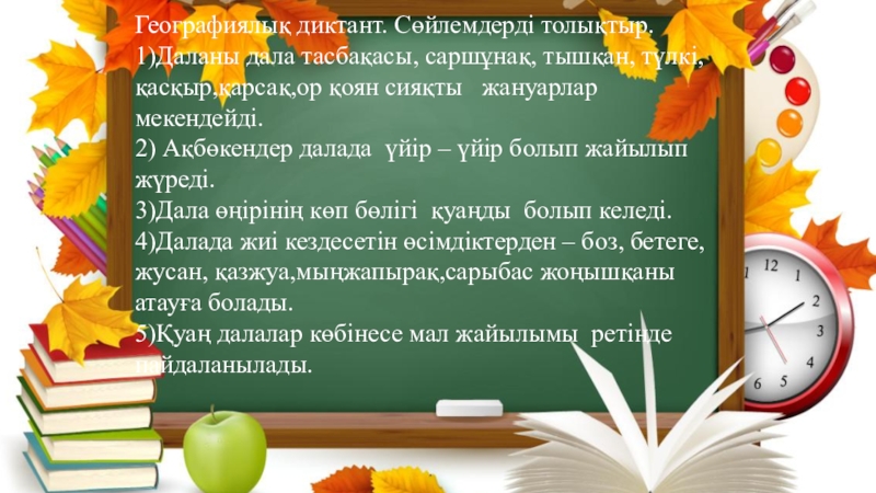 Географиялық диктант. Сөйлемдерді толықтыр.1)Даланы дала тасбақасы, саршұнақ, тышқан, түлкі, қасқыр,қарсақ,ор қоян сияқты  жануарлар мекендейді.2) Ақбөкендер далада