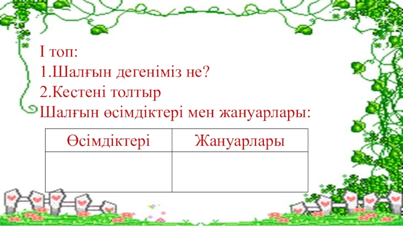 І топ:1.Шалғын дегеніміз не?2.Кестені толтырШалғын өсімдіктері мен жануарлары: