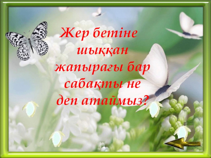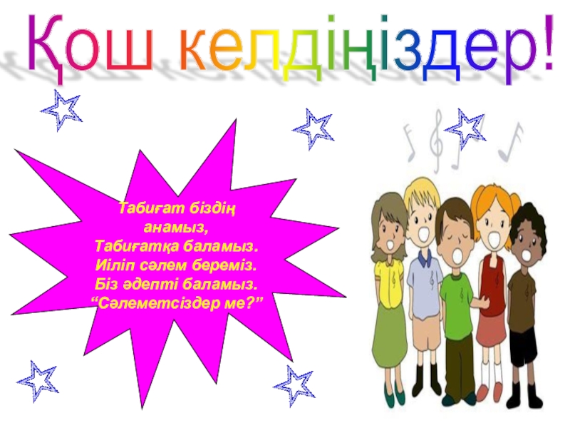 Табиғат біздің анамыз,Табиғатқа баламыз.Иіліп сәлем береміз.Біз әдепті баламыз.“Сәлеметсіздер ме?”Қош келдіңіздер!