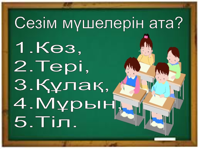 Сезім мүшелерін ата?1.Көз,  2.Тері,  3.Құлақ,  4.Мұрын,  5.Тіл.