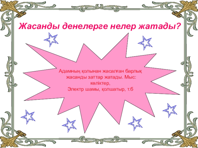 Жасанды денелерге нелер жатады?Адамның қолынан жасалған барлық жасанды заттар жатады. Мыс: көліктер, Электр шамы, қолшатыр, т.б