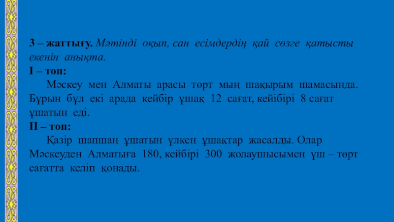 Слайд 143 – жаттығу. Мәтінді оқып, сан есімдердің қай сөзге қатысты екенін