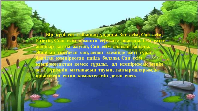 Сан есім, Етістік, Сын есім орманға серуенге шығады. Сол сәтте жаңбыр қатты жауып, Сан есім адасып қалады. Жаңбыр тоқтаған соң, аспан әлемінде жеті түрлі боялған кемпірқосақ пайда болады. Сан есім кемпірқосақтан көмек сұрады, ал кемпірқосақ менің жеті түрімнің мағынасын тауып, тапсырмаларымды орындасаң саған көмектесемін деген екен.