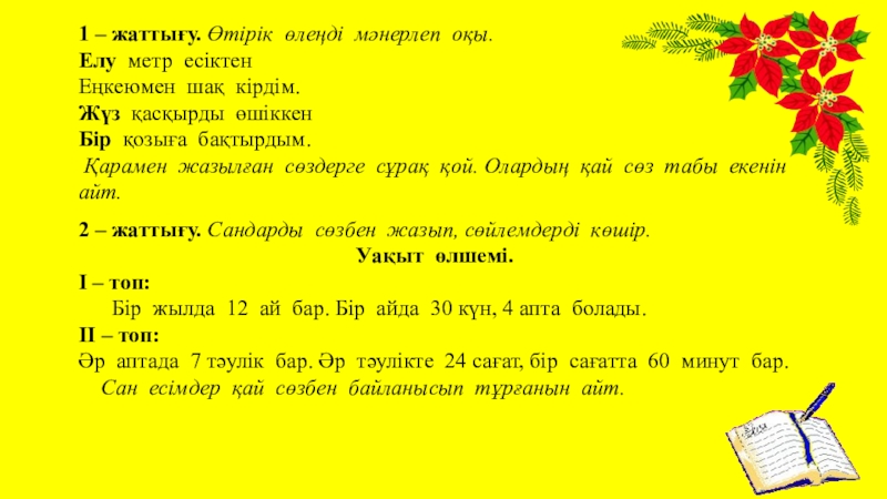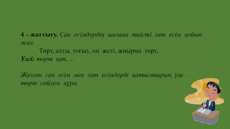 Слайд 164 – жаттығу. Сан есімдердің қасына тиісті зат есім қойып жаз.