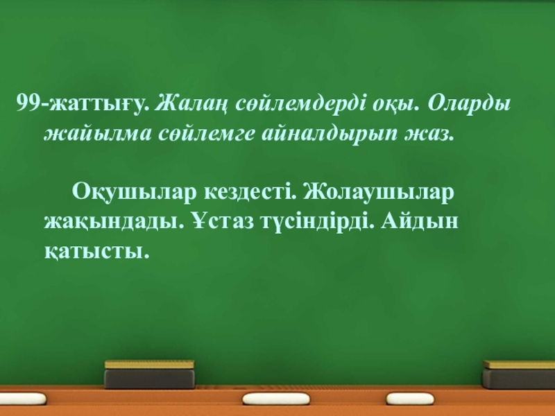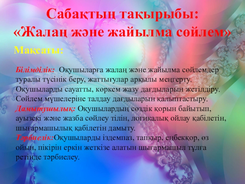 Білімділік: Оқушыларға жалаң және жайылма сөйлемдер туралы түсінік беру, жаттығулар арқылы меңгерту. Оқушыларды сауатты, көркем жазу дағдыларын жетілдіру. Сөйлем мүшелеріне талдау дағдыларын қалыптастыру.