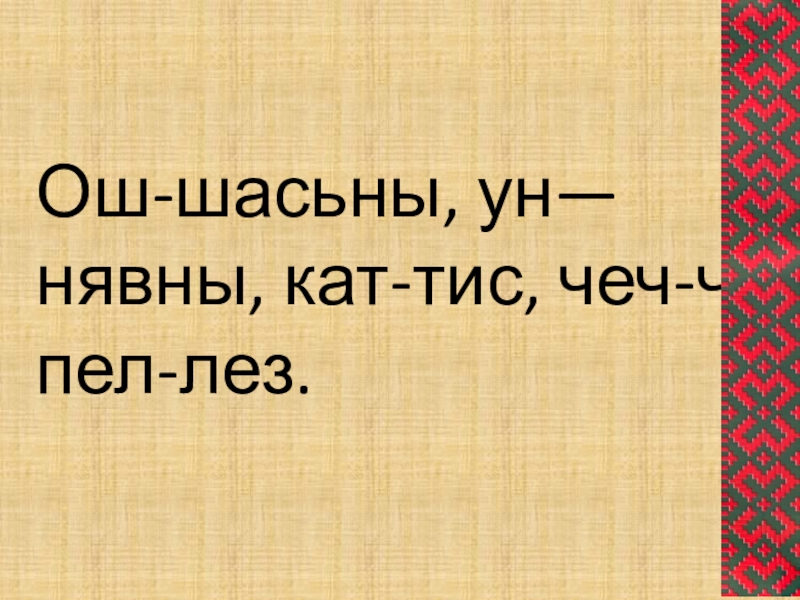 Слайд 13Ош-шасьны, ун—нявны, кат-тис, чеч-чö, пел-лез.