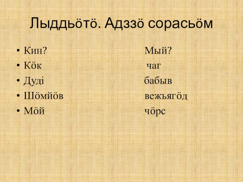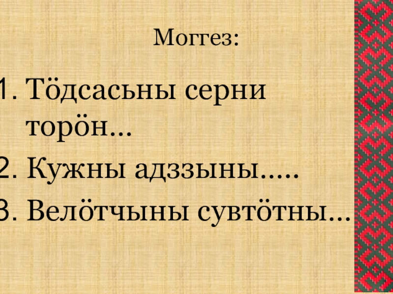 Моггез:Тöдсасьны серни торöн…Кужны адззыны…..Велöтчыны сувтöтны…