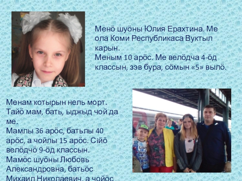 Мамлы 36 арӧс, батьлы 40 арӧс, а чойлы 15 арӧс. Сiйӧ велӧдчӧ 9-ӧд классын.
