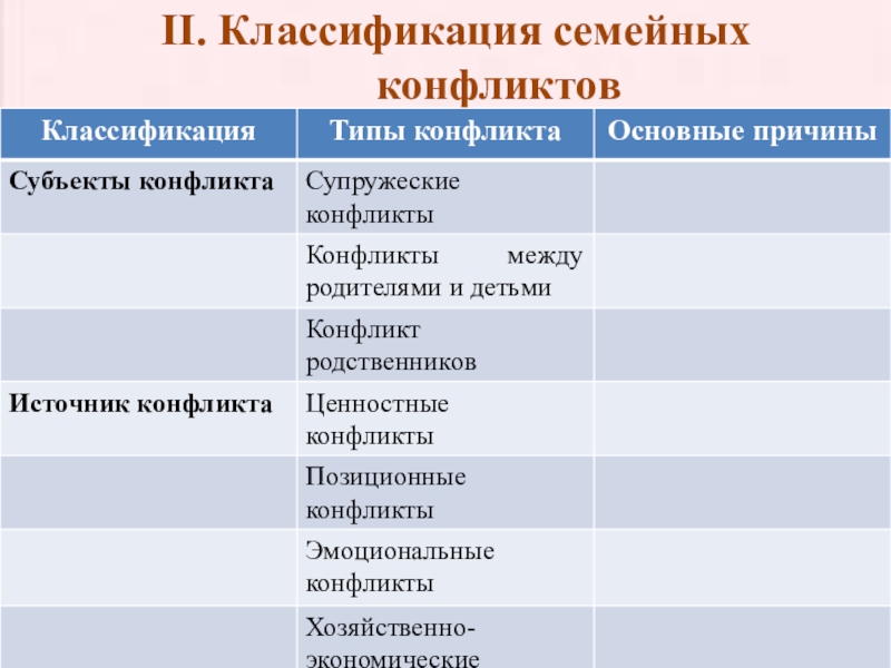 Слайд 7II. Классификация семейных конфликтов
