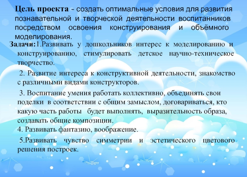 Задачи:1.Развивать у дошкольников интерес к моделированию и конструированию, стимулировать детское научно-техническое творчество.