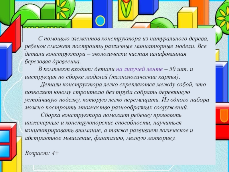 натурального дерева, ребенок сможет построить различные миниатюрные модели. Все детали конструктора – экологически чистая шлифованная березовая древесина.