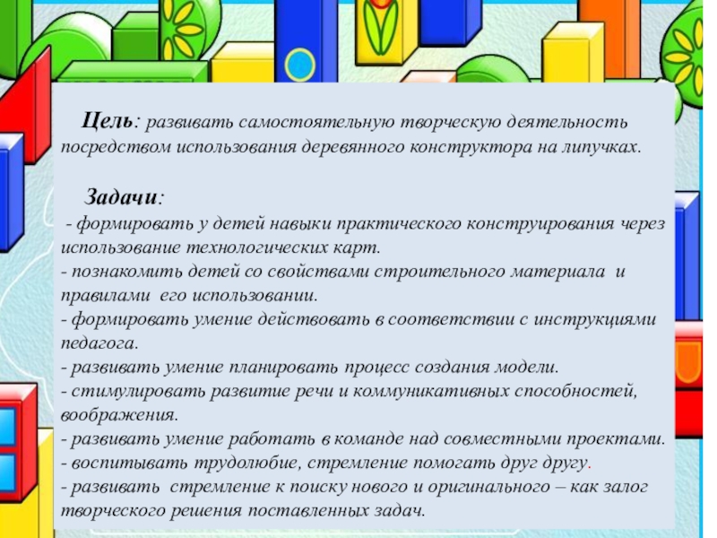 Цель: развивать самостоятельную творческую деятельность посредством использования деревянного конструктора на липучках. Задачи: - формировать у детей навыки практического конструирования через использование технологических карт.- познакомить детей со свойствами строительного материала  и правилами его использовании. - формировать умение