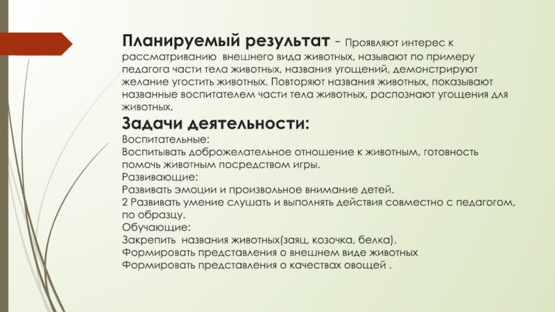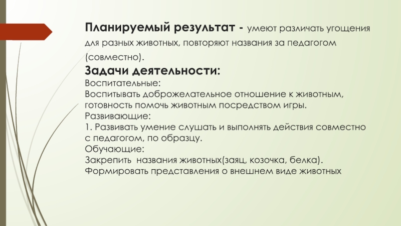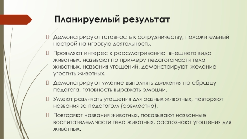 Слайд 18Планируемый результат - умеют различать угощения для разных животных, повторяют названия