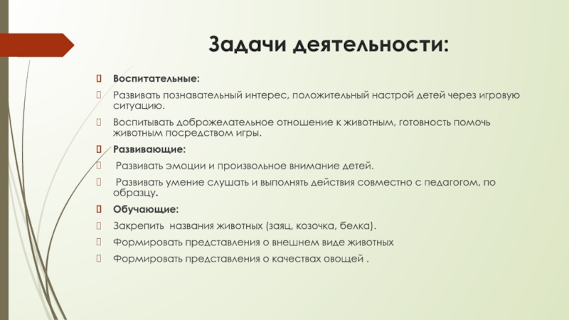 Воспитывать доброжелательное отношение к животным, готовность помочь животным посредством игры.