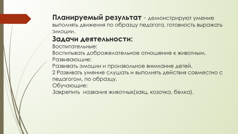 Слайд 14Планируемый результат - Проявляют интерес к рассматриванию внешнего вида животных, называют
