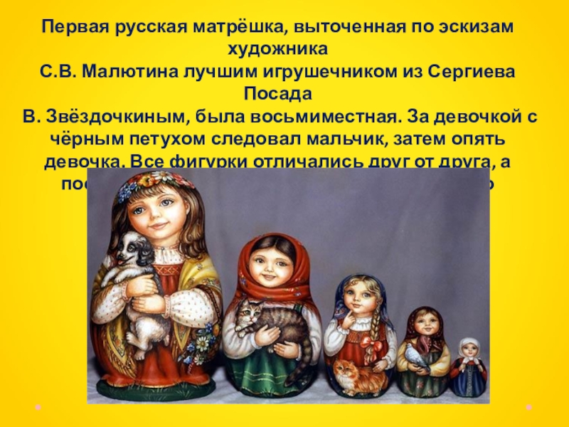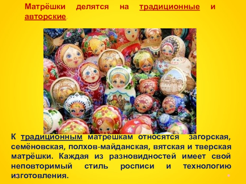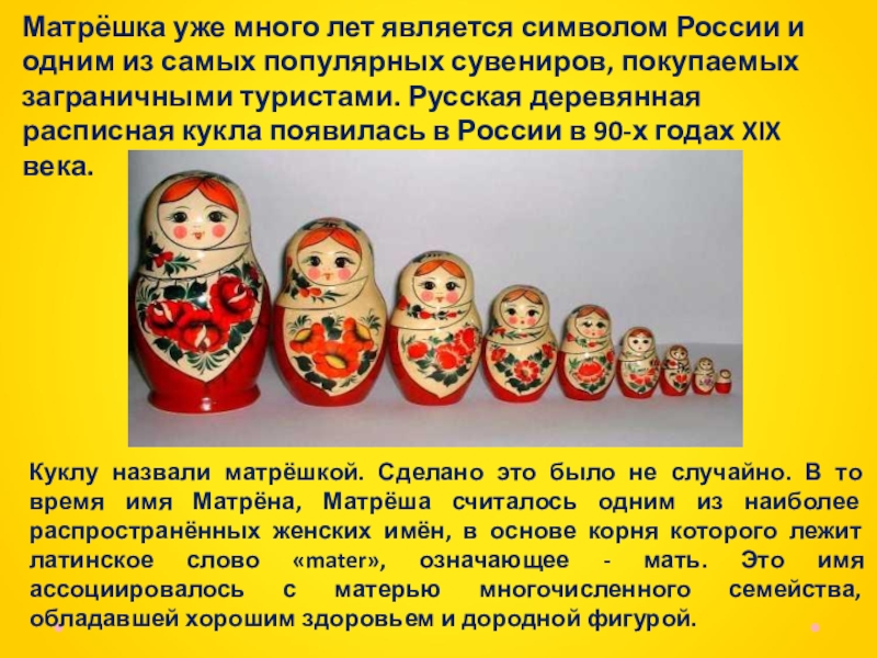 Матрёшка уже много лет является символом России и одним из самых популярных сувениров, покупаемых заграничными туристами. Русская деревянная расписная кукла появилась в России в 90-х годах XIX века.