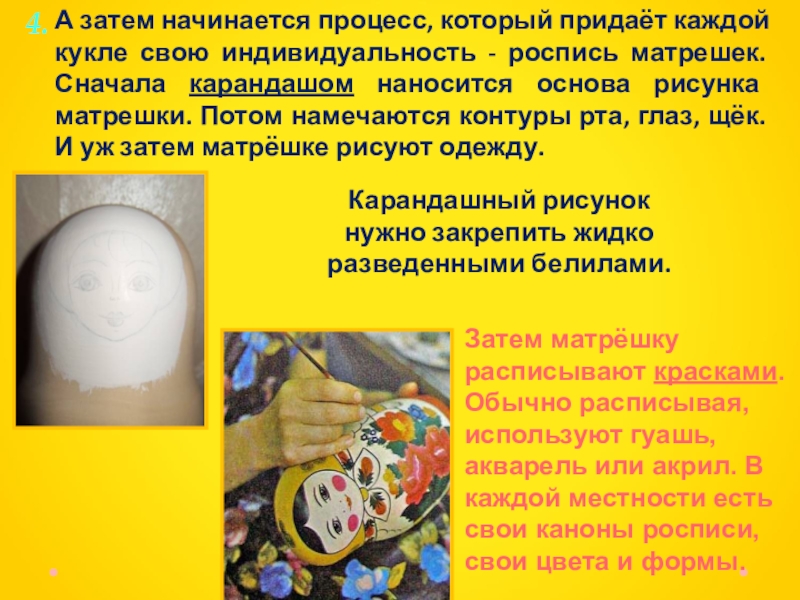 Затем матрёшку расписывают красками. Обычно расписывая, используют гуашь, акварель или акрил. В каждой местности есть свои каноны росписи, свои цвета и формы.