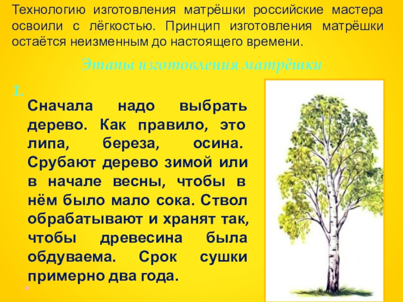Сначала надо выбрать дерево. Как правило, это липа, береза, осина. Срубают дерево зимой или в начале весны, чтобы в нём было мало сока. Ствол обрабатывают и хранят так, чтобы древесина была обдуваема. Срок сушки примерно два года.