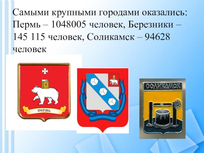 Слайд 20Самыми крупными городами оказались: Пермь – 1048005 человек, Березники – 145 115