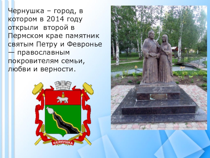 Пермском крае памятник святым Петру и Февронье — православным покровителям семьи, любви и верности.