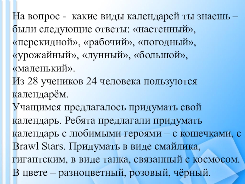Учащимся предлагалось придумать свой календарь. Ребята предлагали придумать календарь с любимыми героями – с кошечками, с Brawl Stars. Придумать в виде смайлика, гигантским, в виде танка, связанный с космосом.