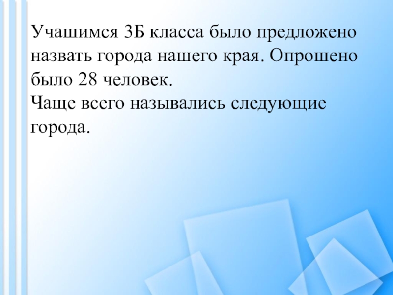 Слайд 17Учашимся 3Б класса было предложено назвать города нашего края. Опрошено было