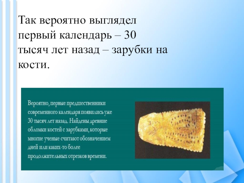 Слайд 30Так вероятно выглядел первый календарь – 30 тысяч лет назад –