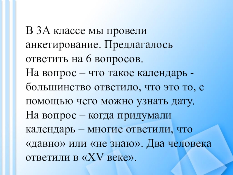 На вопрос – когда придумали календарь – многие ответили, что «давно» или «не знаю». Два человека ответили в «XV веке».