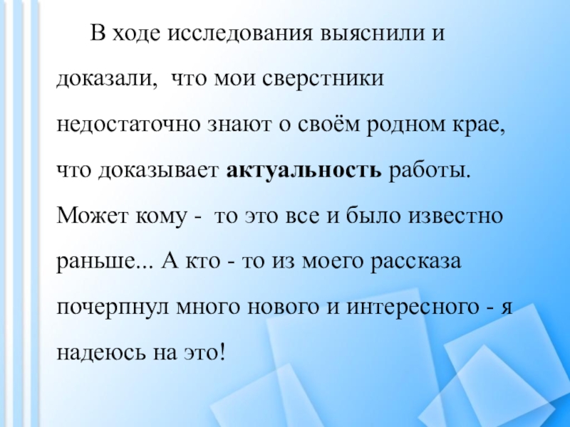 о своём родном крае, что доказывает актуальность работы. Может кому - то это все и было известно раньше... А кто - то из моего рассказа почерпнул много нового и интересного - я надеюсь на это!