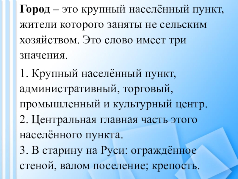 Слайд 12Город – это крупный населённый пункт, жители которого заняты не сельским