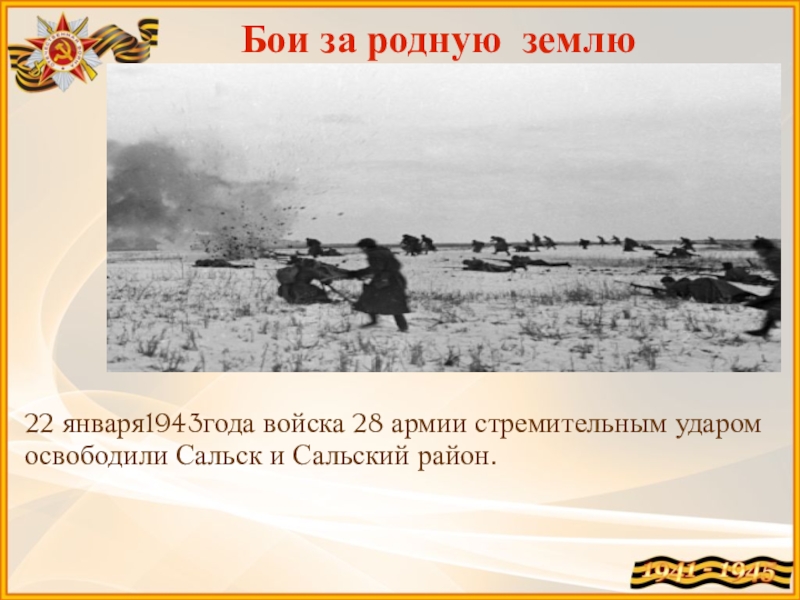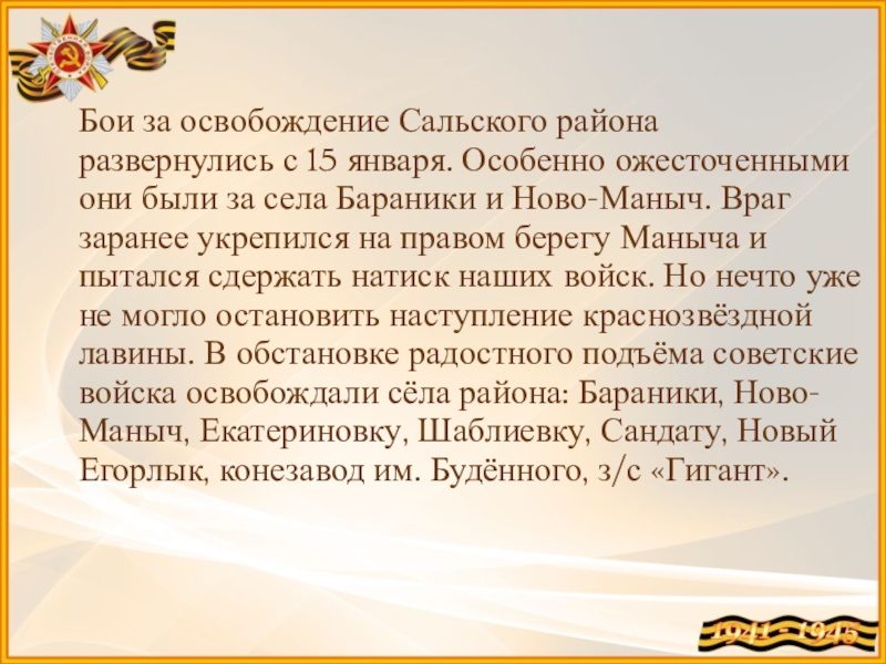 Слайд 14Бои за освобождение Сальского района развернулись с 15 января. Особенно ожесточенными