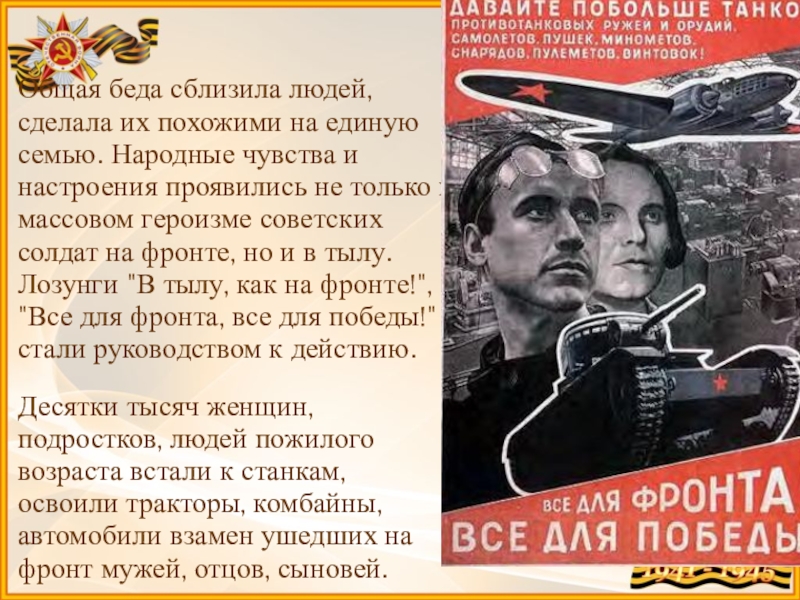 чувства и настроения проявились не только в массовом героизме советских солдат на фронте, но и в тылу. Лозунги "В тылу, как на фронте!", "Все для фронта, все для победы!" стали руководством к действию.