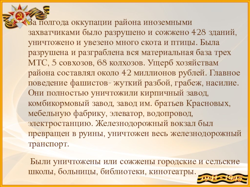 зданий, уничтожено и увезено много скота и птицы. Была разрушена и разграблена вся материальная база трех МТС, 5 совхозов, 68 колхозов. Ущерб хозяйствам района составлял около 42 миллионов рублей. Главное поведение фашистов- жуткий разбой, грабеж, насилие. Они полностью уничтожили кирпичный завод, комбикормовый завод, завод им. братьев Красновых, мебельную фабрику, элеватор, водопровод, электростанцию. Железнодорожный вокзал был превращен в руины, уничтожен весь железнодорожный транспорт.