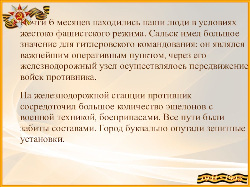 Слайд 7Почти 6 месяцев находились наши люди в условиях жестоко фашистского режима.