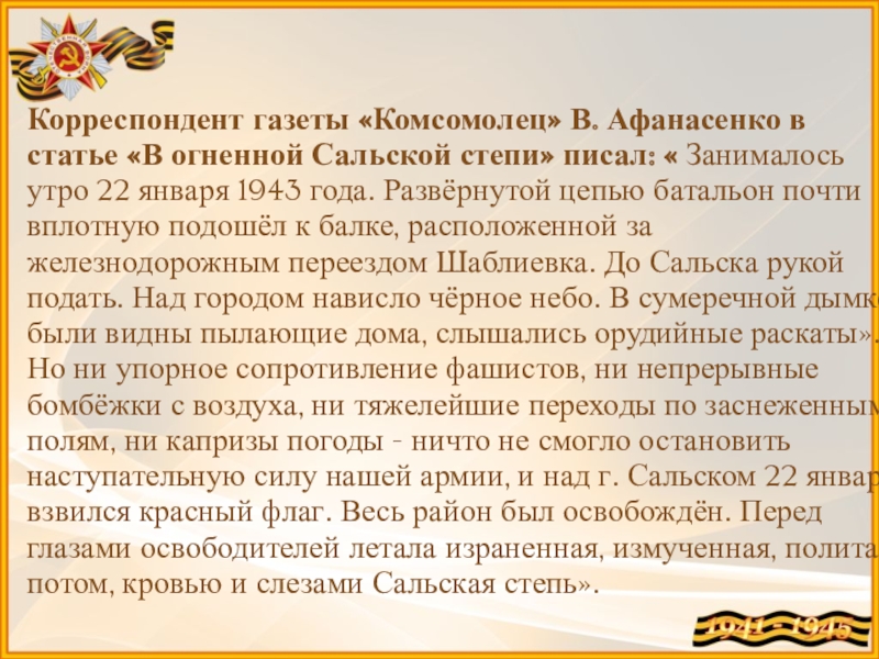 писал: « Занималось утро 22 января 1943 года. Развёрнутой цепью батальон почти вплотную подошёл к балке, расположенной за железнодорожным переездом Шаблиевка. До Сальска рукой подать. Над городом нависло чёрное небо. В сумеречной дымке были видны пылающие дома, слышались орудийные раскаты». Но ни упорное сопротивление фашистов, ни непрерывные бомбёжки с воздуха, ни тяжелейшие переходы по заснеженным полям, ни капризы погоды - ничто не смогло остановить наступательную силу нашей армии, и над г. Сальском 22 января взвился красный флаг. Весь район был освобождён. Перед глазами освободителей летала израненная, измученная, политая потом, кровью и слезами Сальская степь».