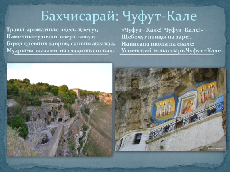 «Чуфут - Кале! Чуфут -Кале!» - Щебечут птицы на заре… Написана икона на скале: Успенский монастырь Чуфут –Кале.