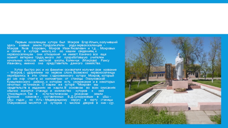 Хутор быстро рос и по фамилии основателя получил свое название – Мокров, с ударением на первом слоге. Возможно первопоселенцы перебрались в эти степи с одноименного хутора Мокров, который до сих пор стоит в 10 километрах от станицы Глазуновской Кумылженского района , о котором есть упоминание и в некоторых печатных источниках. О нашем же хуторе "Мокров« мы свидетельств в изданиях не нашли. В основном во всех описаниях обычно значится станица и количество хуторов к ней относящихся. Так в «Ста-тистическом описании земли Донских казаков » , составленных В.Д.Сухоруковым в 1822 – 1832 годах , по Усть – Медведицкому округу в юрту станицы Глазуновской числятся 16 хуторов с числом дворов в них – 237.