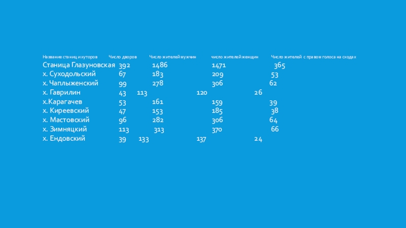 Слайд 13Название станиц и хуторов Число дворов Число жителей