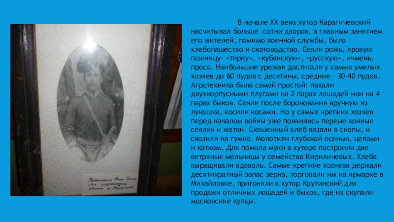 В начале ХХ века хутор Карагичевский насчитывал больше сотни дворов, а главным занятием его жителей, помимо военной службы, было хлебопашество и скотоводство. Сеяли рожь, яровую пшеницу- «тирку», «кубанскую», «русскую», ячмень, просо. Наибольшие урожаи достигали у самых умелых хозяев до 60 пудов с десятины, средние – 30-40 пудов. Агротехника была самой простой: пахали двухкорпусными плугами на 2 парах лошадей или на 4 парах быков. Сеяли после боронования вручную из лукошка, косили косами. Но у самых крепких хозяев перед началом войны уже появились первые конные сеялки и жатки. Скошенный хлеб вязали в снопы, и свозили на гумно. Молотили глубокой осенью, цепами и катком. Для помола муки в хуторе построили две ветряных мельницы у семейства Кириличевых. Хлеба выращивали вдоволь. Самые крепкие хозяева держали десятикратный запас зерна, торговали им на ярмарке в Михайловке, пригоняли в хутор Крутинский для продажи отличных лошадей и быков, где их скупали московские купцы.